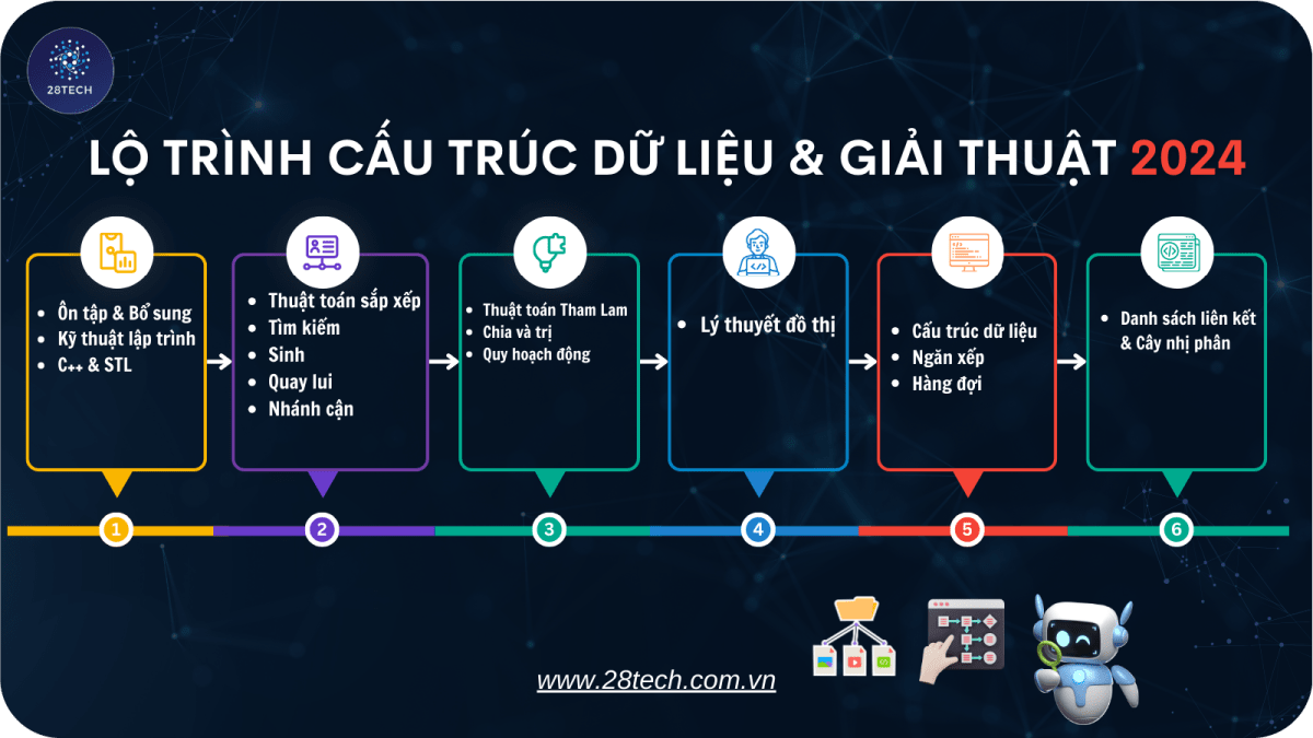 Bạn đang tìm kiếm một khóa học chuyên sâu để nắm vững Cấu trúc dữ liệu và Giải thuật – kỹ năng cốt lõi để trở thành một lập trình viên chuyên nghiệp? Khóa học Cấu trúc dữ liệu và Giải thuật 2024 của 28tech chính là sự lựa chọn hoàn hảo, giúp bạn làm chủ từ những kiến thức cơ bản đến nâng cao thông qua các buổi học lý thuyết và bài tập thực hành chi tiết.